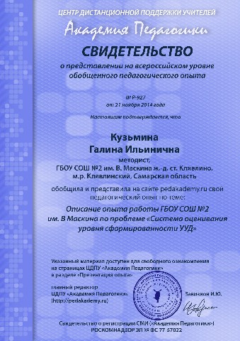 Свидетельство о предоставлении на всероссийском уровне обобщенного педагогичнеского опыта |