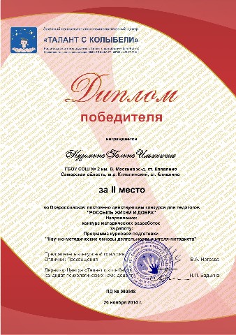 Диплом победителя во Всероссийском конкурсе для педагогов "Россыпь жизни и добра" |